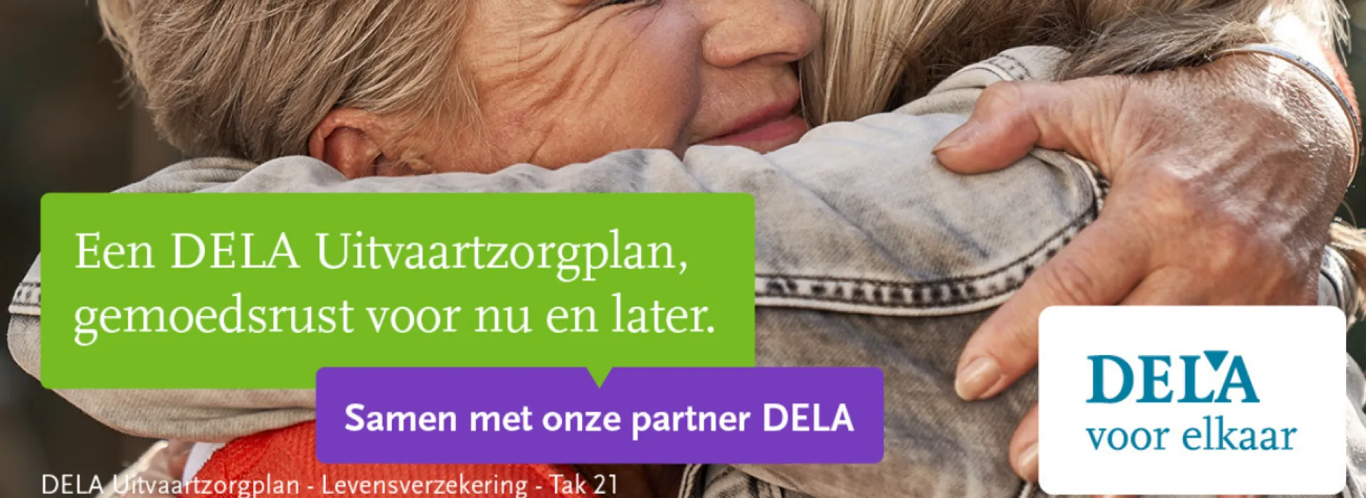 DELA Natura- en levensverzekeringen N.V. – Belgisch bijkantoor (ondernemingsnr. 0665.931.229) gelegen te Noorderplaats 5 bus 2 te 2000 Antwerpen, bijkantoor van DELA Natura- en levensverzekeringen N.V., vennootschap naar NL recht (KvK-nummer 17078393), gelegen te Oude Stadsgracht 1, 5611DD Eindhoven, NL, toegelaten voor Tak 21 levensverzekeringen onder codenr. 2864; fabrikant DELA Uitvaartzorgplan, levensverzekering Tak 21 onderworpen aan BE recht – dekt levenslang uw uitvaartkosten voor het bedrag waarvoor u verzekerd bent. Men is niet gedekt voor een overlijden dat het gevolg is van een uitgesloten risico, met name zelfmoord binnen het jaar na de inwerkingtreding van de polis; vrijwillige deelname aan collectieve gewelddaad/terreur of oorlog (professionele omstandigheden [bv. militairen, politie, brandweer] uitgezonderd); misdaad of wanbedrijf indien men deze als (mede)dader pleegde. Voor extra bijstand, psychologische bijstand, repatriëring & vervroegde terugkeer gelden specifieke beperkingen en uitsluitingen. Deze vindt u terug in de Algemene Voorwaarden. Offerte, premieberekening en Algemene Voorwaarden: www.dela.be en/of uw makelaar. Klachten: contact@dela.be of Ombudsman Verzekeringen (de Meeûsplantsoen 35, 1000 Brussel). Indien u kosteloos een kopie wenst van de Algemene Voorwaarden, gelieve een e-mail te richten aan info@dela.be. Aan deze tekst kunnen geen rechten worden ontleend. Enkel de Algemene en Bijzondere Voorwaarden zijn bindend.